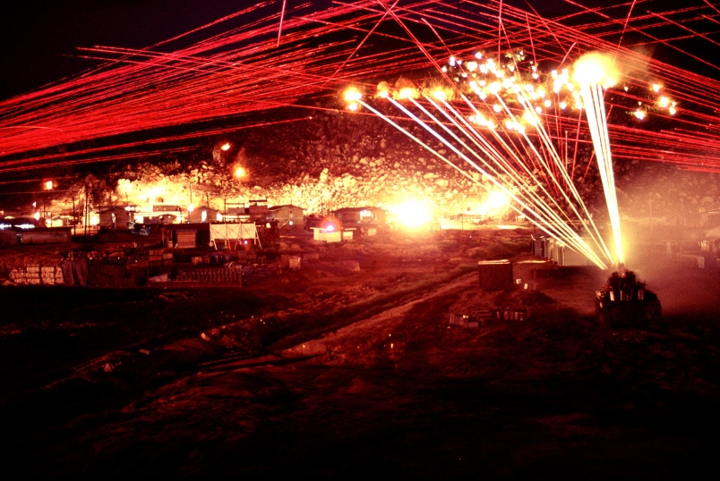 The white tracers with explosions are from twin 40 mm (1.57 inch) anti-aircraft Bofor guns mounted on an open turret M42 Duster track. The 40 mm guns were the same as the familiar navy anti-aircraft Pom-Pom guns. We actually had U.S. Navy manuals for them. The bright white lights at ground level are hand launched parachute flares that hit the ground and are still burning. You can also see some of the rounds ricocheting off the rocks.