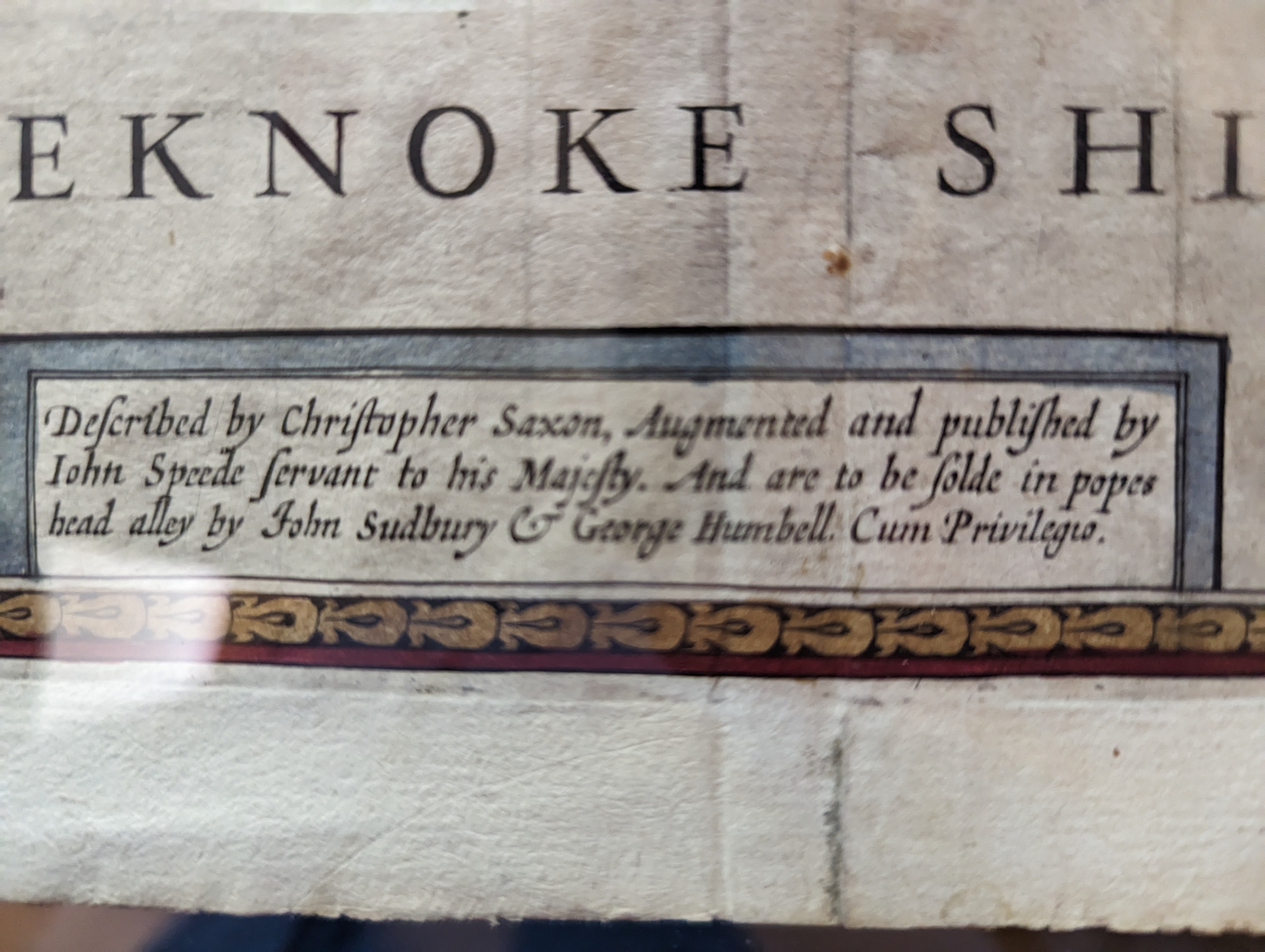 Described by Christopher Saxton, Augmented and published by / Iohn Speede Servent to his Majesty. And are to be solde in popes / head alley by John Sudbury & George Humbell. Cum Privilegio.