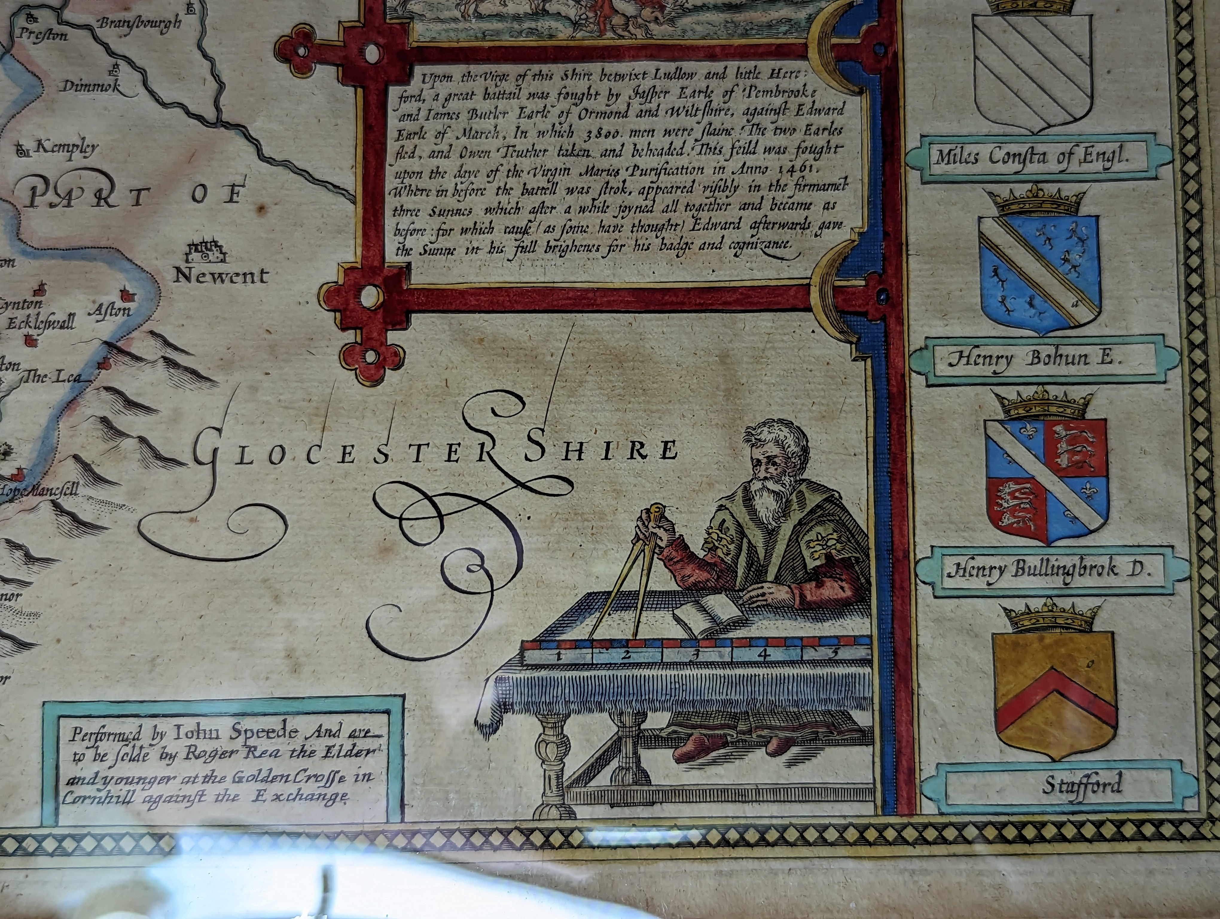 Performed by Iohn Speede And are / to be Solde by Roger Rea the Elder and younger at the Golden Crosse in Cornhill against the Exchange
